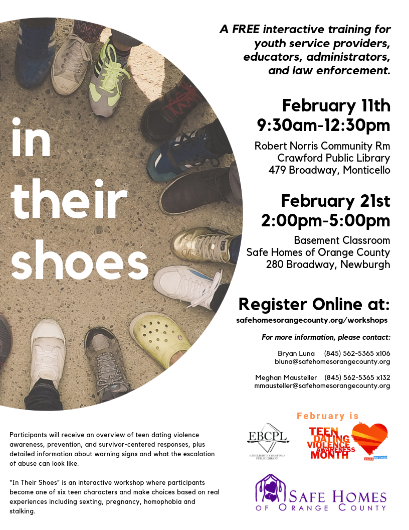 “In Their Shoes” is an interactive workshop where participants become one of six teen characters and make choices based on real experiences including sexting, pregnancy, homophobia and stalking. Participants will receive an overview of teen dating violence awareness, prevention, and survivor-centered responses, plus detailed information about warning signs and what the escalation of abuse can look like.