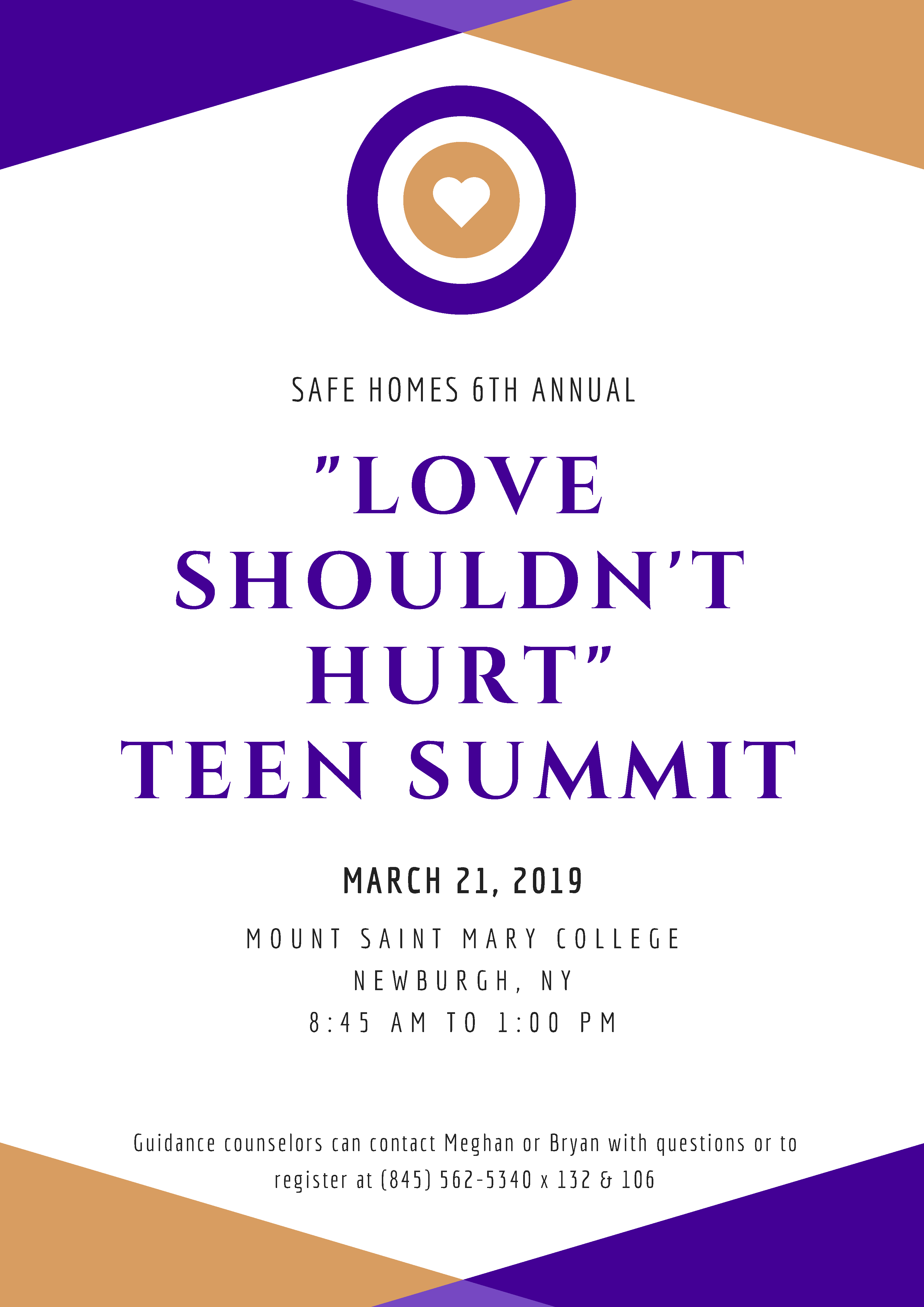 Safe Homes of Orange County is pleased to invite area 9th-12th grade students to our 6th Annual “Love Shouldn’t Hurt” Teen Summit on March 21, 2019 at Mount Saint Mary College in Newburgh, NY.