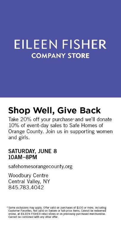 On Saturday, June 8th, take 20% off your purchase at Eileen Fisher Company Store and they will donate 10% of event-day sales to Safe Homes.